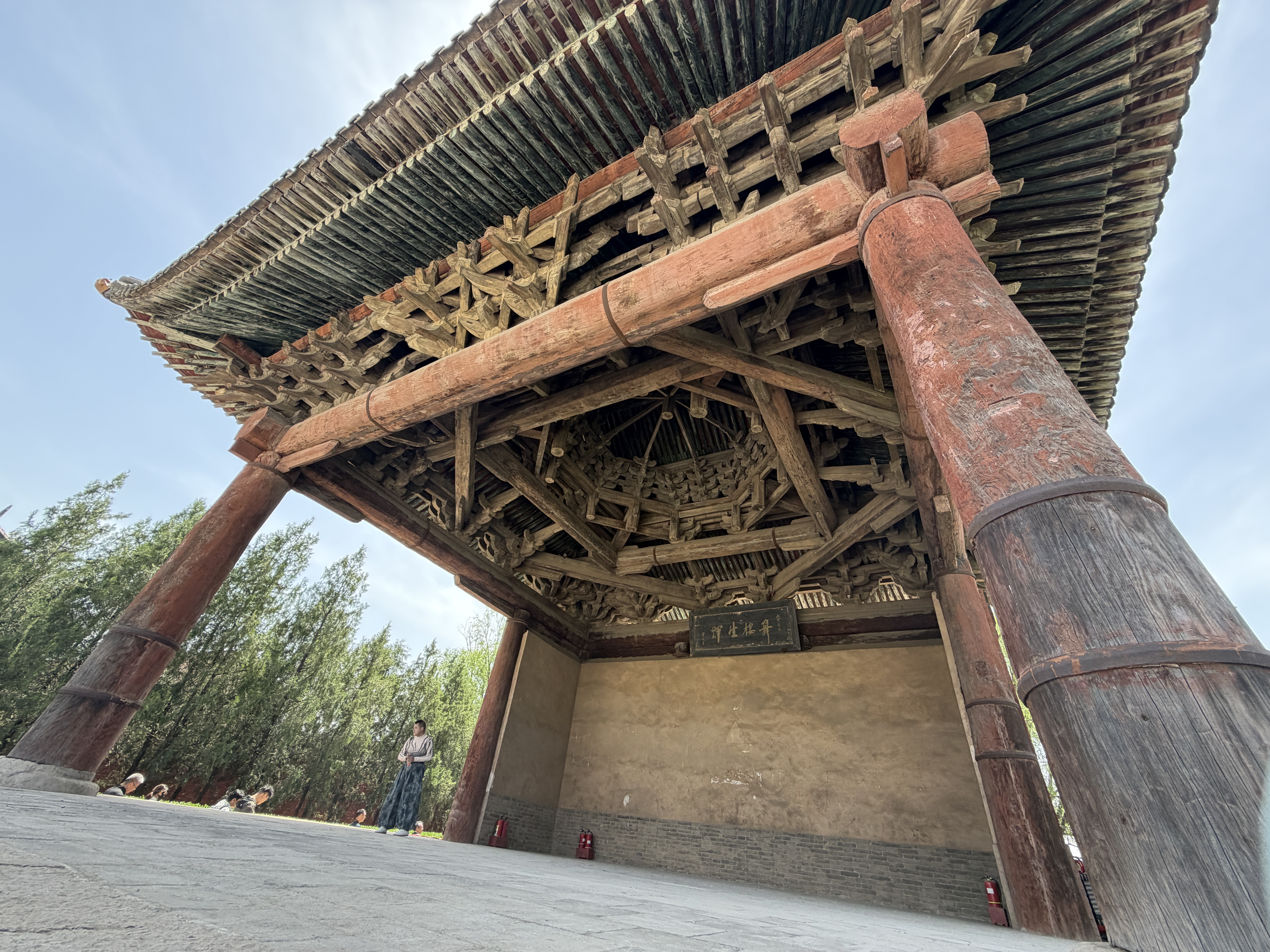 石磊提到,目前国内保存相对完好的元代舞楼仅八座,而四圣宫元代舞楼是其中有着明确纪年的一座。同时,这座舞楼也保留了元代舞楼的颇多特点,譬如舞楼四角立脚柱四根,两侧后部及背部立撑柱四根,共八根柱子支撑顶部的载荷。“还有建筑的内部,八根戗围绕中间硕大的雷公柱,形成了一个非常精巧又异常庞大的斗八藻井。此外,元代舞楼的台上不分前场后场,东西两边都是镂空的,可以进行三面观看。”