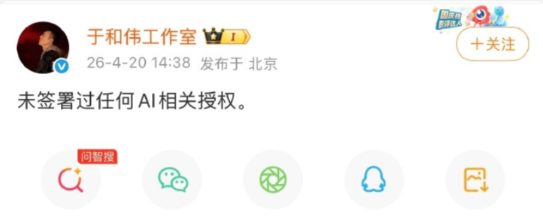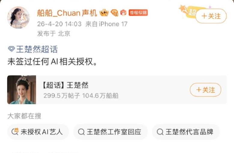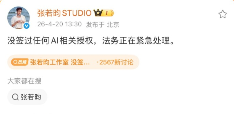 当天下午,张若昀工作室率先发布严正声明,称“没签过任何AI相关授权,法务正在紧急处理”。紧接着,于和伟工作室、王楚然后援会官方账号、李一桐方面等接连发声,均明确表示“未签署任何AI相关授权”。