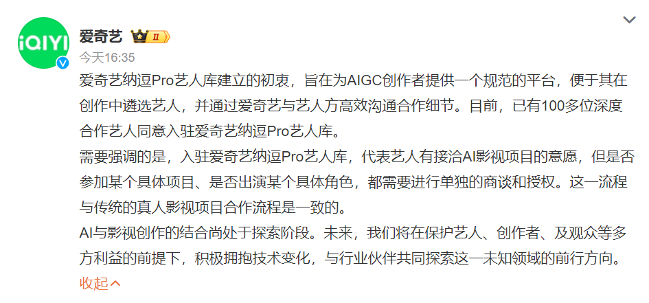 下午四时许,爱奇艺官方发布声明称,艺人库的建立初衷是为AIGC创作者提供一个规范的平台。目前已经有100多位艺人同意入驻AI艺人库,但是否参加某个具体项目、是否出演某个具体角色,都需要进行单独的商谈和授权。