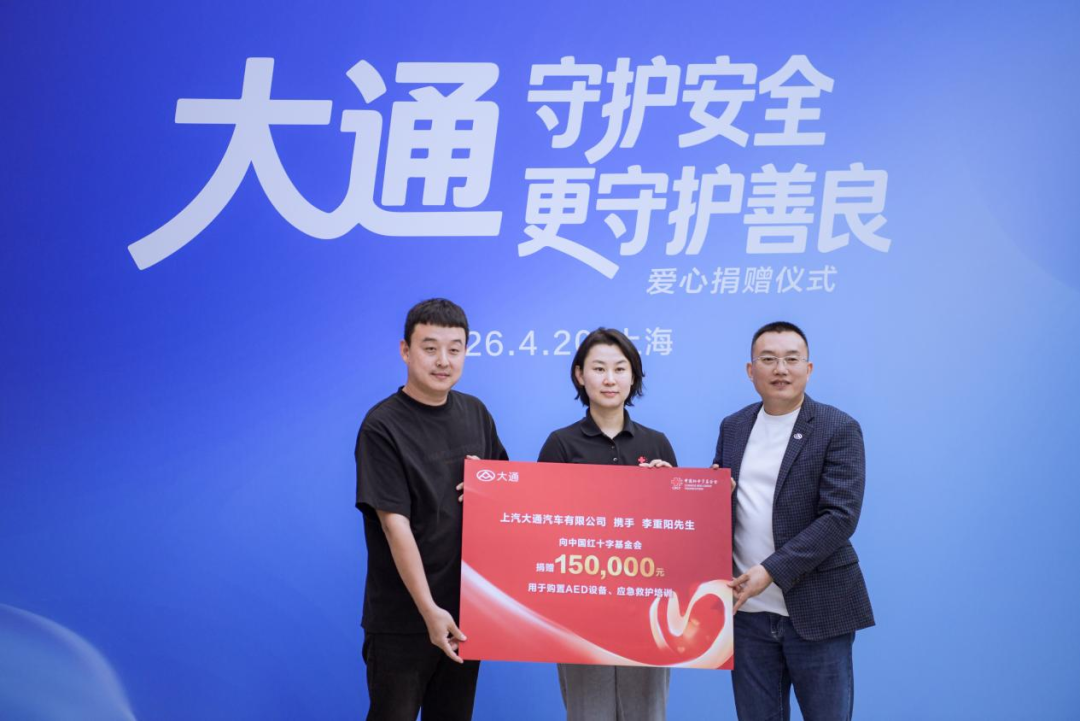 作为国有汽车企业,上汽大通积极履行社会责任,联合爱心车主共同向中国红十字基金会捐赠15万元,专项用于AED设备采购、社会普及推广及公众应急救护知识科普培训,助力完善全民应急救援体系。