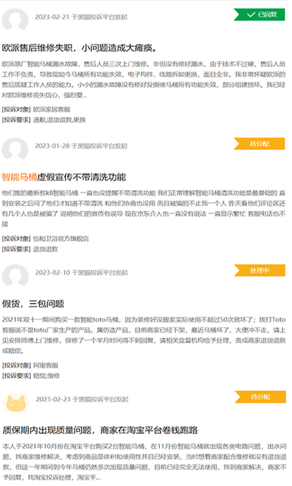 在“黑猫投诉”平台搜索“智能马桶”“智能坐便器”“智能马桶盖”等关键词,涌现出数千条投诉记录,投诉问题五花八门:譬如有消费者遇到与笔者相似问题,即维修人员技术不过硬,导致产品其他功能失效;有的消费者遇到问题产品,使用一年时间便经历数次维修;有的因安装人员接反了净水管和污水管,导致用户出现妇科感染;还有的产品涉及虚假宣传,货不对板,或是产品本身涉嫌假冒伪劣等等,不一而足。庞大的投诉量一方面从侧面说明中国消费者对智能坐便器产品的接受度日益增长,但更直观地则是反映出该市场的一些行为“失调”。